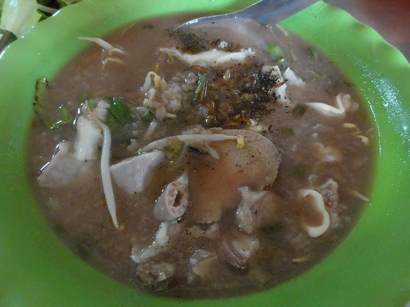This morning Morena and I went to breakfast with Hồng and the gang. Since we didn't meet up until 730, the cơm tấm place was already closed. We kept walking until we arrived at a still-open place that served cháo lòng. I'd had cháo (rice porridge) before, once in Hanoi with heart meat and once here with duck, and I'd liked both so I was game for this option. Well, cháo lòng is kind of different. It is made with pork intestines and the ever-popular congealed blood cubes. I thought it was fine, flavor-wise, but my intestines were not quite as convinced.